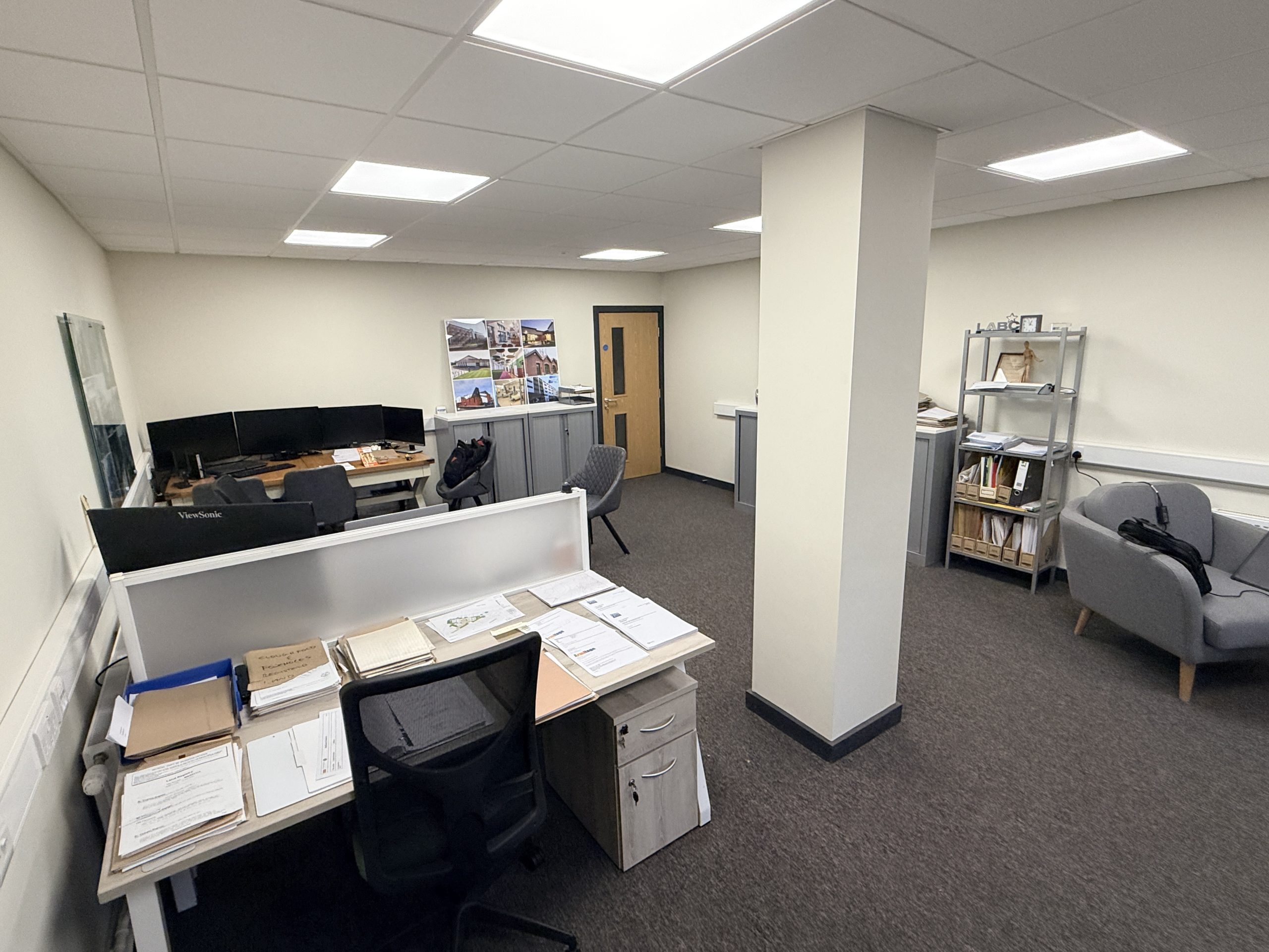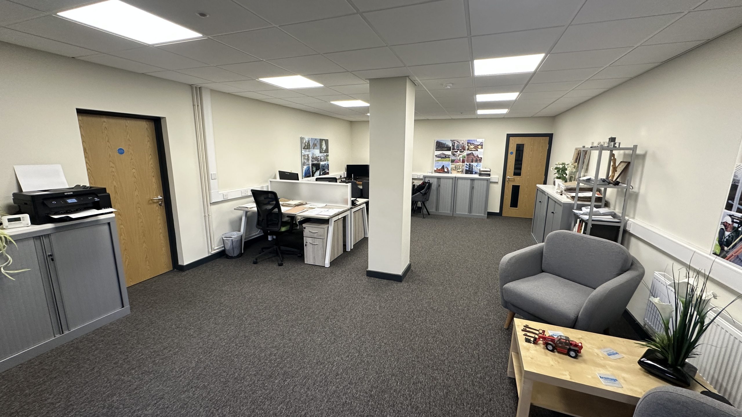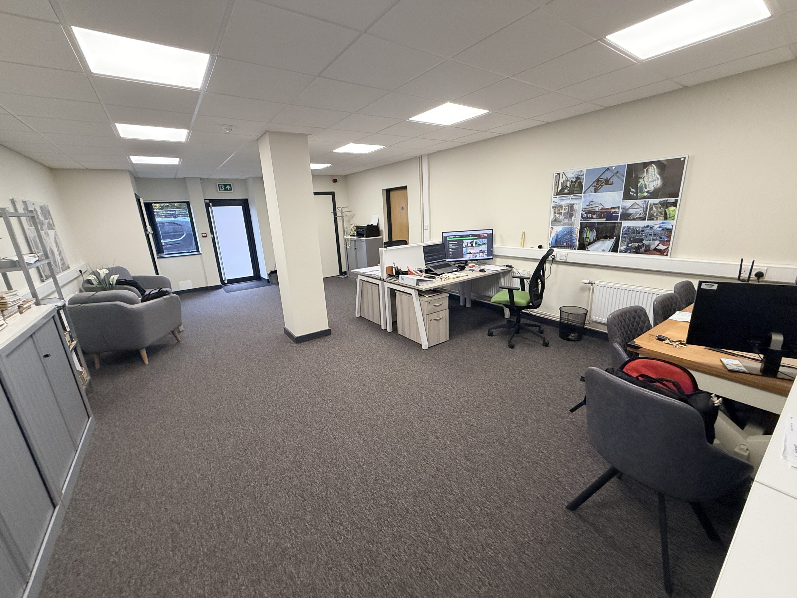 Ground Floor 1,850 sq ft gross internal area, including reception, office 1, lobby, kitchen area, ladies/disabled and gents toilet, office area 2, store room and main industrial/warehouse area with access via a motorised roller door.